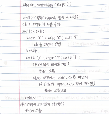 사실 실행 예시가 '('<-소괄호로 이루어진 것밖에 없어서 case 에서 종류를 없애고 아예 open_ch의 존재를 없애버려도 되지만 기존 check_matching 함수와 최대한 비슷하게 냅두고 싶어서 그대로 둔다!