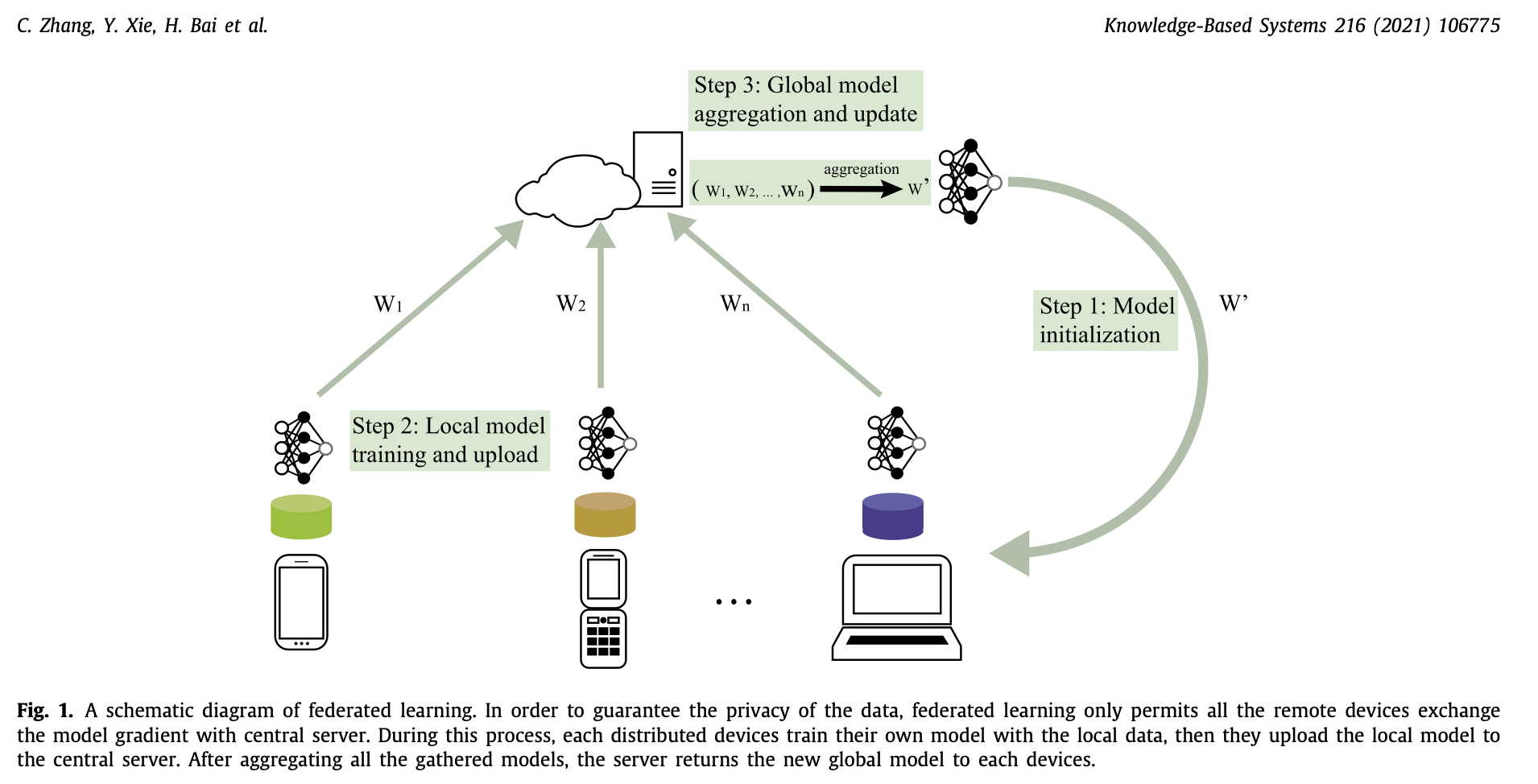 - 각 device가 local data를 local training(각 클라이언트의 원본 데이터는 로컬에 저장&외부로 전송되거나 이동되지 않는다)